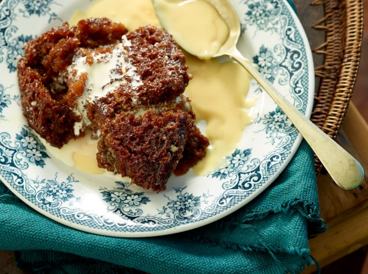 Pour into an oven-proof dish, and bake for 45 to 50 minutes. In a pot, melt together the ingredients for the sauce. When the cake is halfway baked, take it out of oven. Make holes in the cake and pour the sauce over the pudding. Return to the oven.