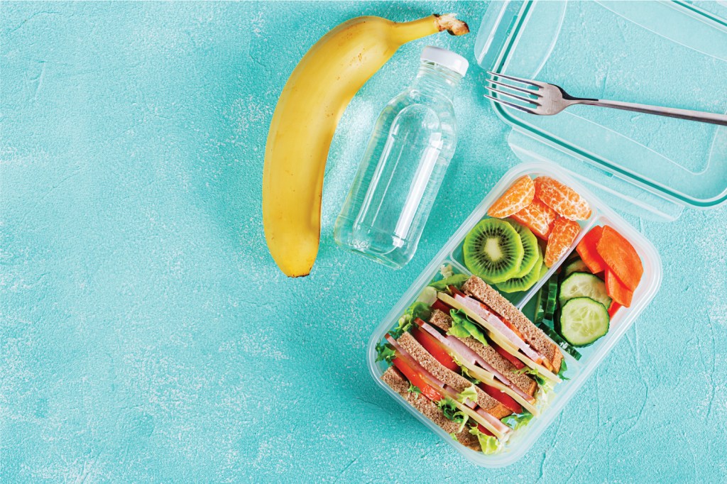 You will need bread, mayonnaise, fresh lettuce, 1 cooked chicken breast (sliced or pulled), tomatoes, Melrose cheese slices and some red onion. Spread mayo on your slice of bread, then layer it with lettuce, chicken, tomatoes, cheese and onion. It’s easy, delicious and have only 450 calories!Add a simple fruit salad: - Cut up some nectarines, apples, grapes or any of your favourite fruits. Put it in a small Tupperware and pack it with your sandwich.